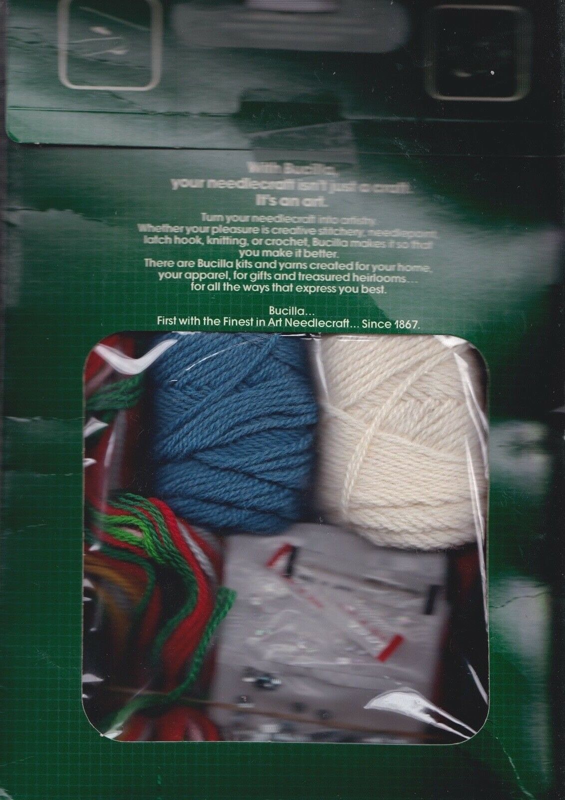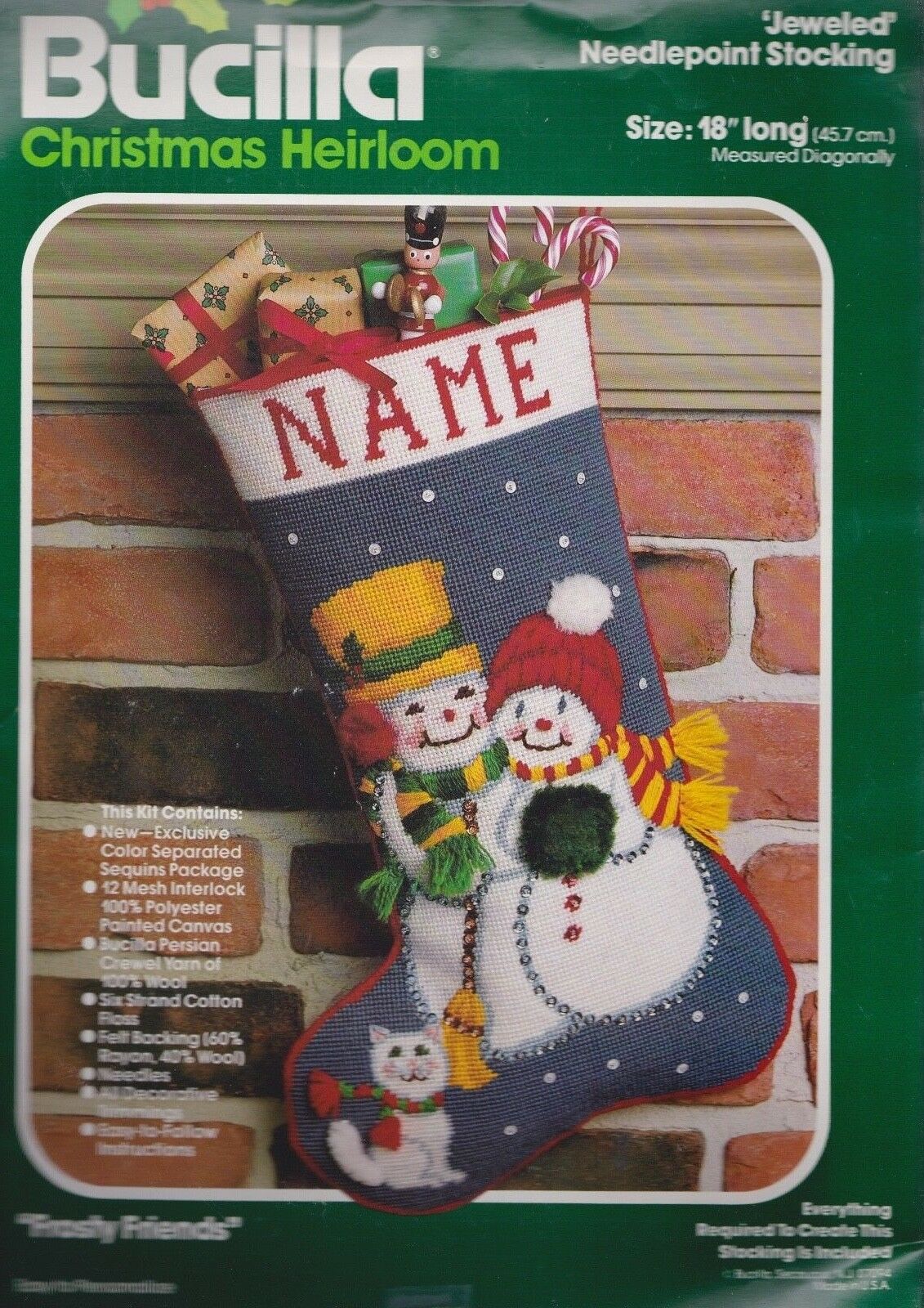 "Frosty Friends" Sequined Needlepoint Stocking Kit * This Kit Uses Mostly YARN to Complete * * Brand - Bucilla * Size - 18" * Package Condition - New in original package - the box packaging shows wear. Contents are complete. * Year - No year on Package Kit contains - - Persian crewel yarn - 12 mesh interlock polyester painted canvas - cotton floss - felt for stocking back - all decorative trimmings - needles - easy instructions ** Many of our craft kits are older or vintage and will have some wear to the outside packaging (including price tag residue in some cases). If there is anything worth noting (a tear, missing pieces, open package, etc.), it will be noted in the package condition above. Otherwise, while they may not be in pristine condition, they are sealed and complete with no damage to the contents.