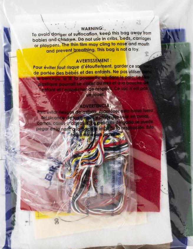 Kit contains - - stamped felts - cotton embroidery floss - color separated sequins and beads - needles - easy instructions