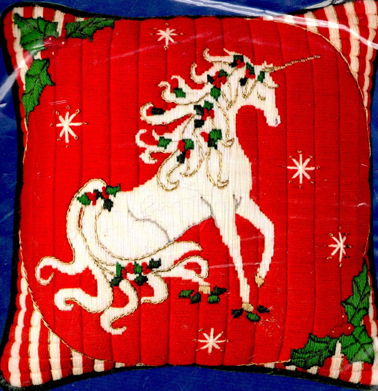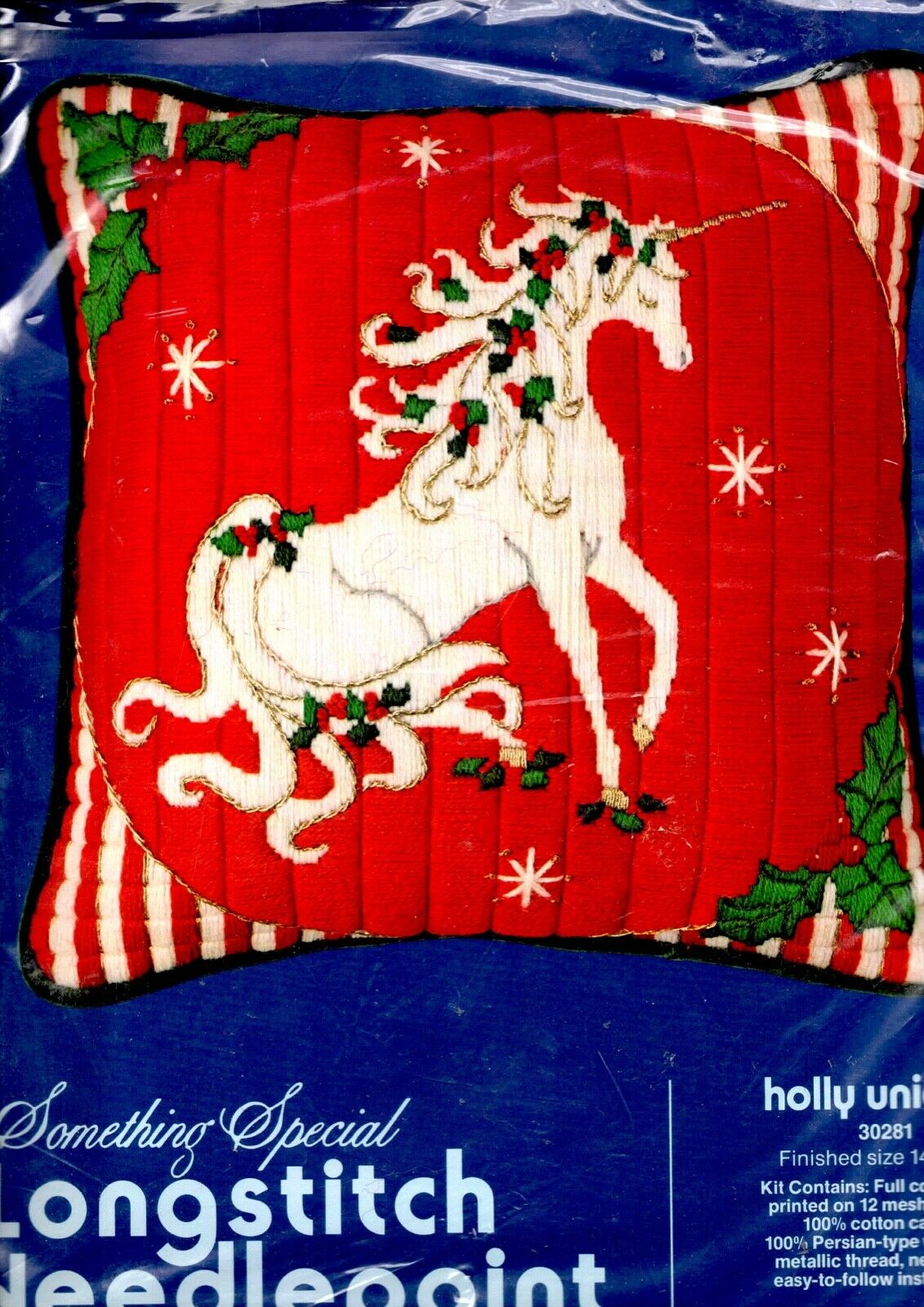 "Holly Unicorn" Longstitch Needlepoint Pillow Cushion Top Kit * This Kit Uses Mostly YARN to Complete * * Brand - Candamar/Something Special * Size - 14" x 14" * Package Condition - New in Original Package. * Date - 1982 Kit contains - - design printed on 12 mesh interlock cotton canvas - wool yarn - metallic thread - needle - easy instructions ** Many of our craft kits are older or vintage and will have some wear to the outside packaging (including price tag residue in some cases). If there is anything worth noting (a tear, missing pieces, open package, etc.), it will be noted in the package condition above. Otherwise, while they may not be in pristine condition, they are sealed and complete with no damage to the contents. ** Feel Free to Ask Questions