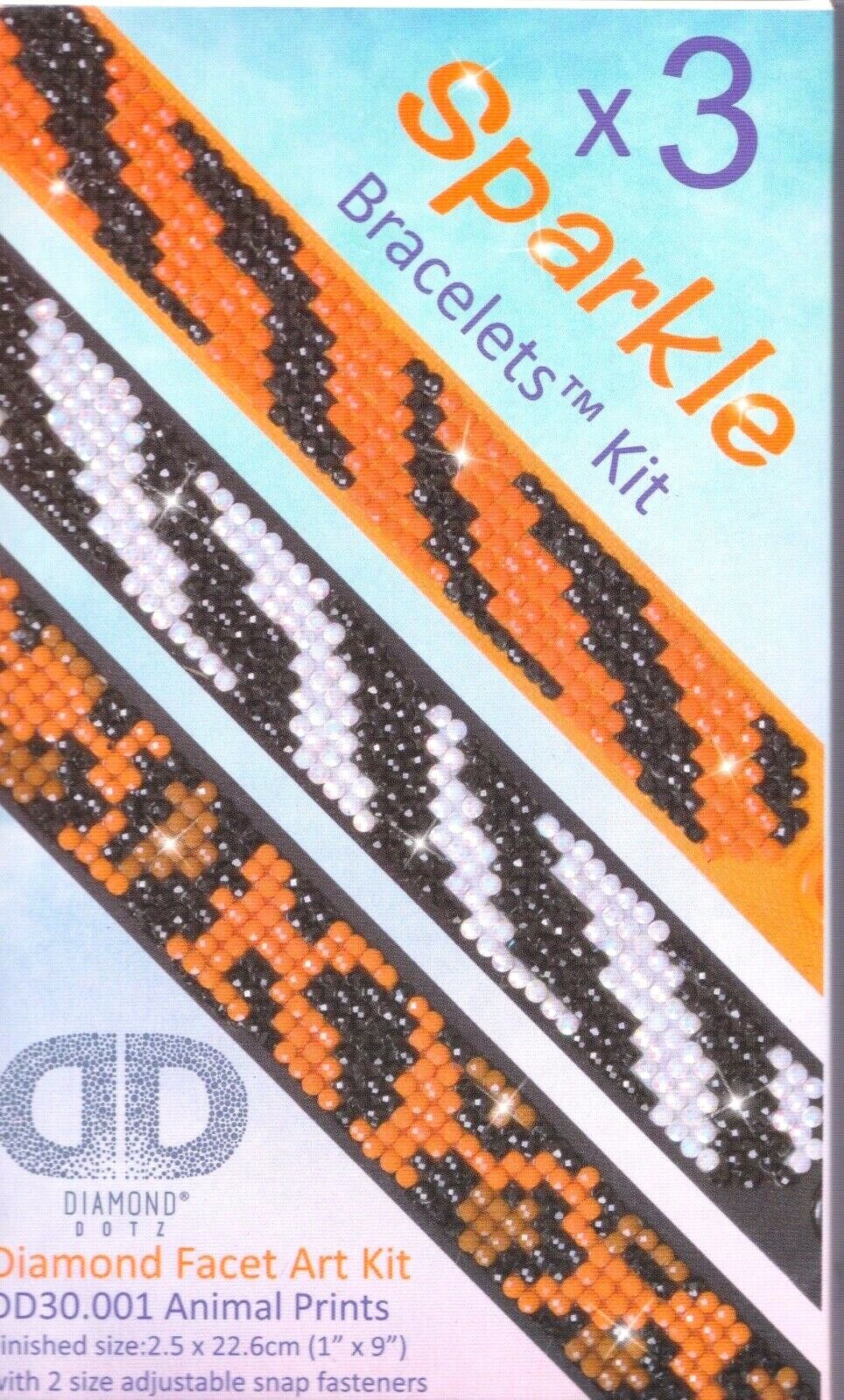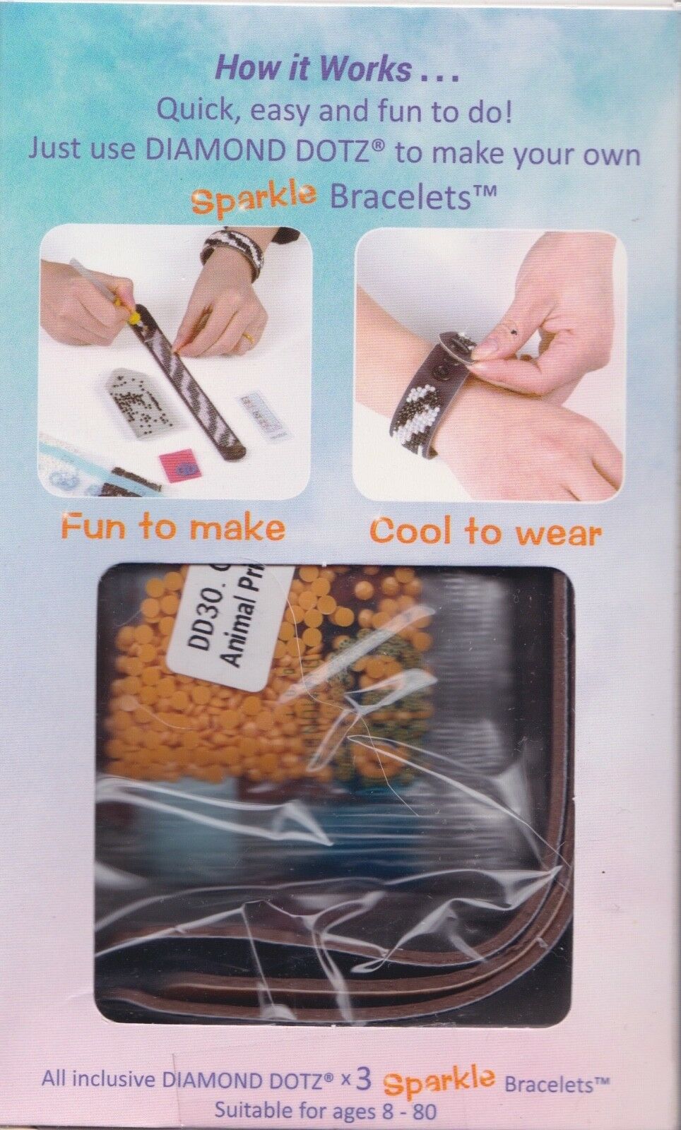 Diamond Dotz Animal Prints Sparkle Bracelet Craft Kit. Makes 3 bracelets - Animal Prints - This item is new, but box is crushed a little on the corner - contents are not affected. Average size 1" x 9" Kit contents: - "Animal Prints" Bracelets x3 ready to decorate with Diamond Dotz - Diamond Dotz presorted by shade - Diamond Dotz Stylus, Craft Tray and Wax - Complete instructions Suitable for ages 8-80 * Diamond Dotz Facet Art provides a stunning shimmery finished product. * Color Coded Sign Chart makes these easy to follow and complete by matching the diamond like facets to the sign coded bracelets.. * Facet adhesive is pre-applied to the bracelet, so all you have to do is attach the facets. * Easy and Fun
