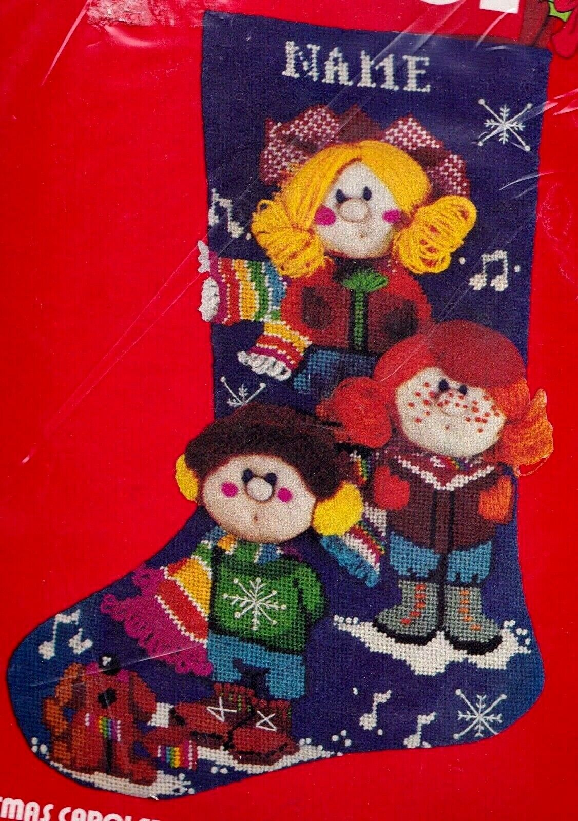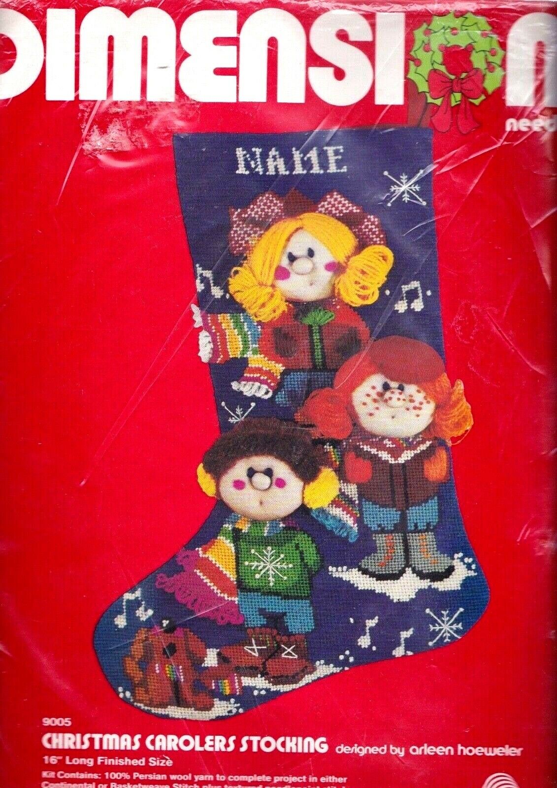 "Christmas Carolers" Needlepoint Stocking Kit * This Kit Uses Mostly YARN to Complete * * Brand - Dimensions * Size - 16" * Package Condition - New in original sealed package. * Year - 1981 * Designed by - Arleen Hoeweler Kit contains - - cotton embroidery floss to add fine details - Persian wool to complete project in either continental or basketweave stitch plus textured needlepoint stitches - design printed in full color on 12 mesh canvas - felt for stocking back - nylon fabric - pom poms - polyester fiberfill - needle - easy instructions including an alphabet for personalizing. ** Many of our craft kits are older or vintage and will have some wear to the outside packaging (including price tag residue in some cases). If there is anything worth noting (a tear, missing pieces, open package, etc.), it will be noted in the package condition above. Otherwise, while they may not be in pristine condition, they are sealed and complete with no damage to the contents.