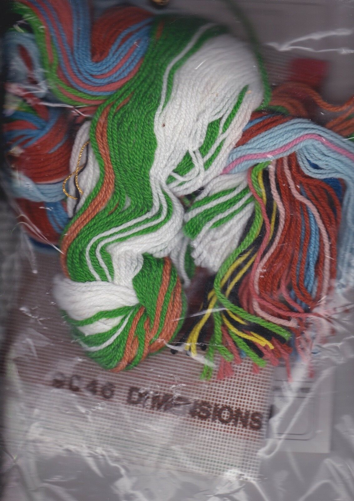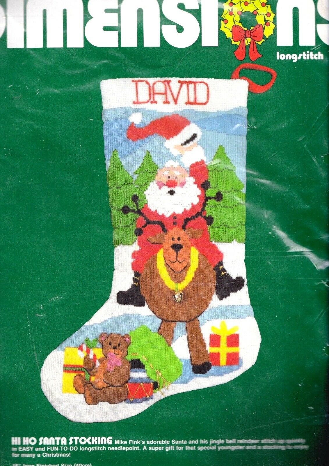 "Hi Ho Santa" Longstitch Needlepoint Stocking Kit * Brand - Dimensions * Size - 16" * Package Condition - New in original sealed package. * Year - 1984 * Designed by - Mike Fink Kit contains - - wool and acrylic yarns - cotton embroidery thread - design printed on 12 mesh cotton canvas - gold metallic thread - metal bell - felt for stocking back - needle - easy instructions including an alphabet for personalizing. ** Many of our craft kits are older or vintage and will have some wear to the outside packaging (including price tag residue in some cases). If there is anything worth noting (a tear, missing pieces, open package, etc.), it will be noted in the package condition above. Otherwise, while they may not be in pristine condition, they are sealed and complete with no damage to the contents.