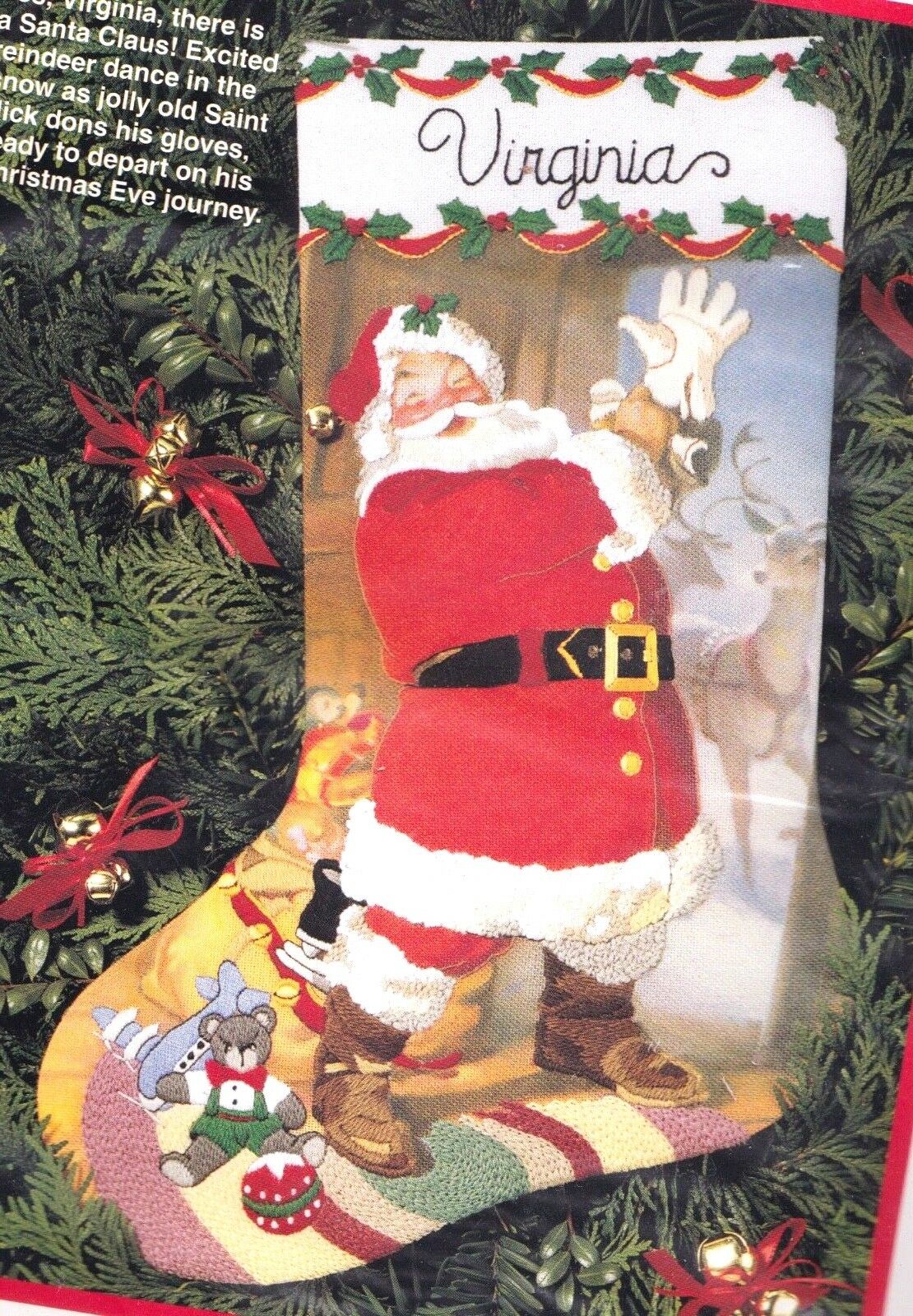 • Kit contains - - cotton embroidery thread - Persian wool and acrylic yarns - gold metallic thread - design printed on homespun with selected areas marked for stitching - fabric for stocking back - gold jingle bell - needle - easy instructions including an alphabet for personalizing.