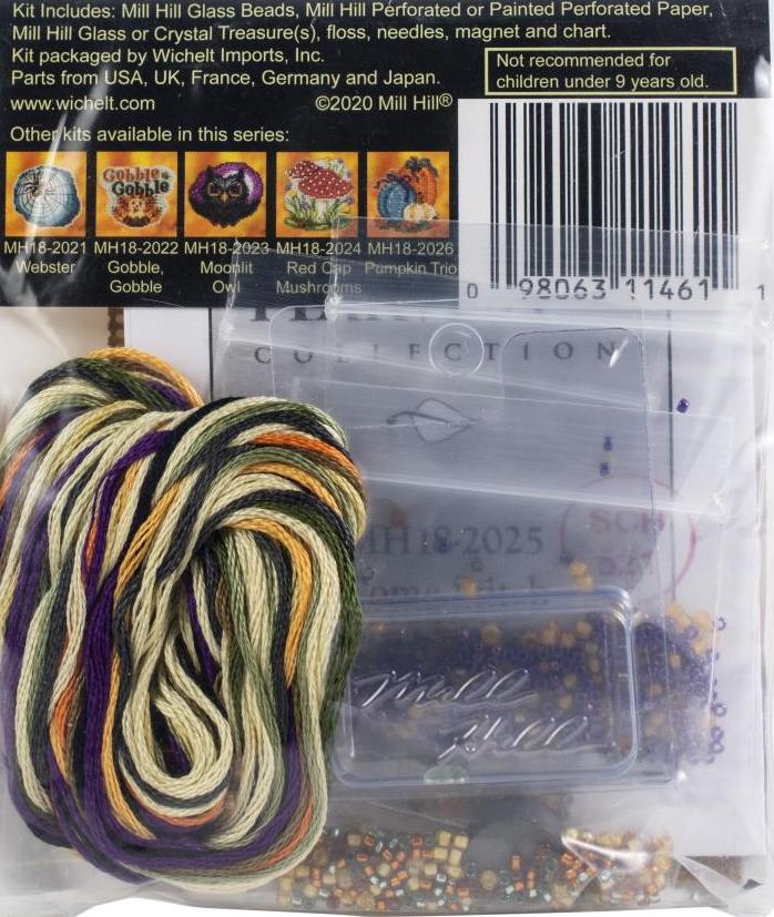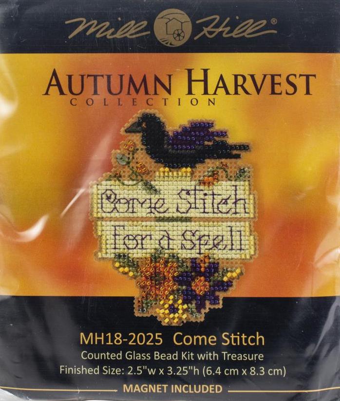 Come Stitch for a Spell Mill Hill Counted Glass Bead Treasure Magnet Ornament Kit Makes 1 Ornament Size - 2.5" x 3.25" Kit contents: - Mill Hill Glass Beads - Mill Hill 14ct perforated or painted perforated paper - Mill Hill Glass or Crystal Treasure - Floss - Needles - Magnet - Chart