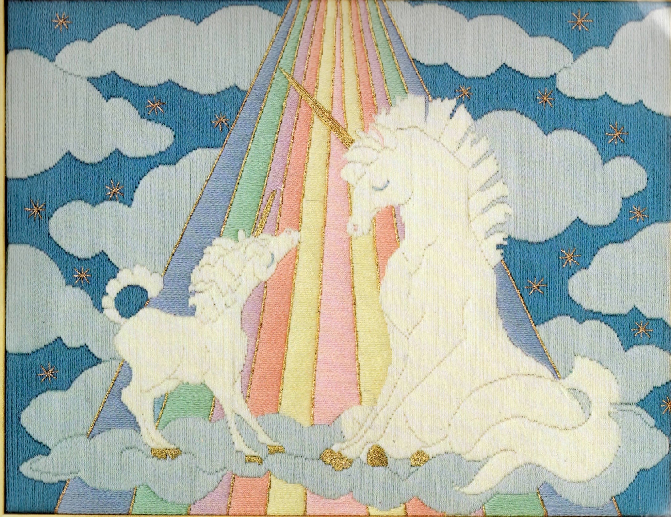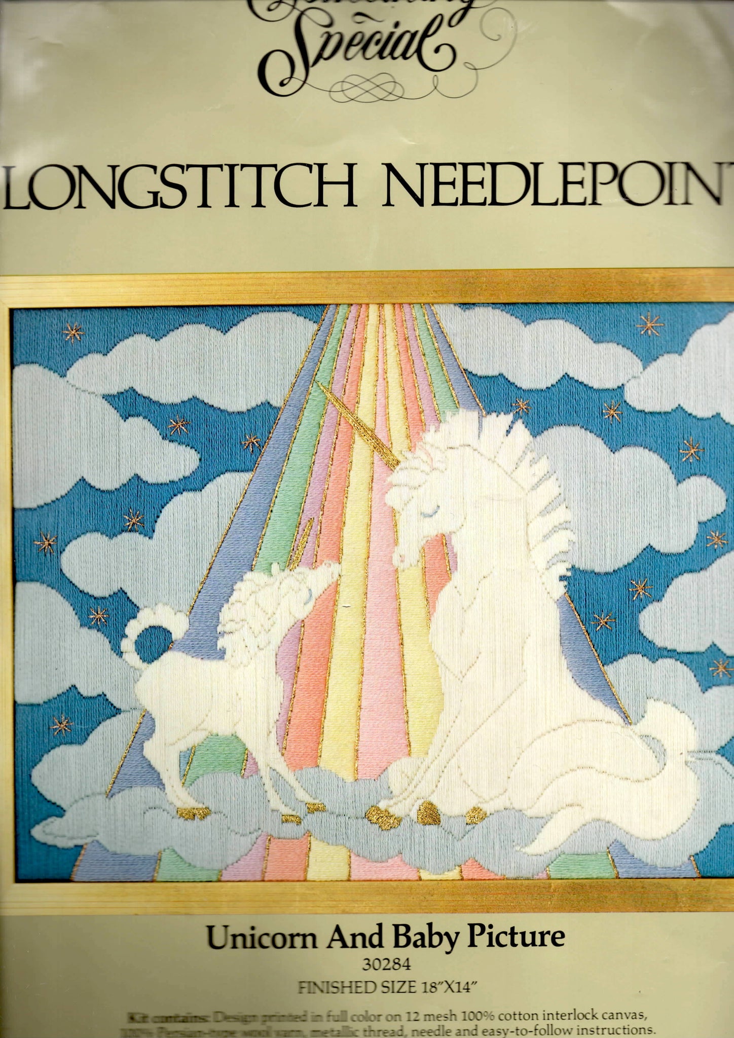 "Unicorn and Baby Picture" Longstitch Needlepoint Wall Hanging Kit * This Kit Uses Mostly YARN to Complete * * Brand - Candamar/Something Special * Size - 18" x 14" * Package Condition - This item has been Repackaged. Contents are complete. * Date - 1982 Kit contains - - design printed on 12 mesh interlock cotton canvas - wool yarn - metallic thread - needle - easy instructions ** Many of our craft kits are older or vintage and will have some wear to the outside packaging (including price tag residue in some cases). If there is anything worth noting (a tear, missing pieces, open package, etc.), it will be noted in the package condition above. Otherwise, while they may not be in pristine condition, they are sealed and complete with no damage to the contents. ** Feel Free to Ask Questions