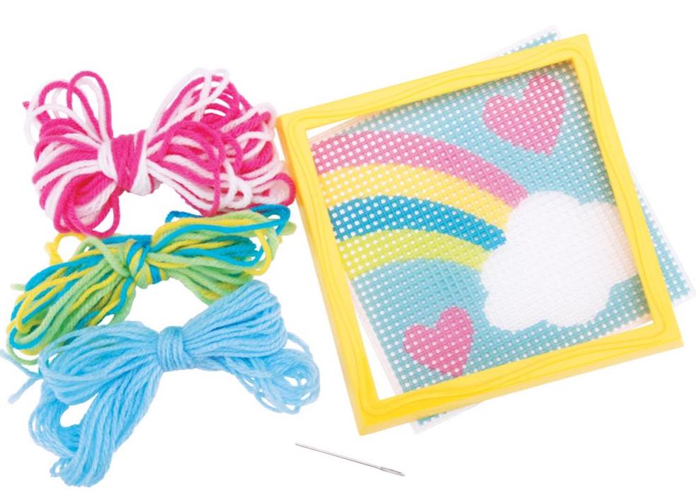 "Rainbow & Hearts" Beginner Needlepoint Starter Kit * Brand - Sew Cute * Size - 6" x 6" * Package Condition - New * Skill Level - Beginner Kit contains - 1 piece printed mesh 1 plastic frame yarn needle instructions